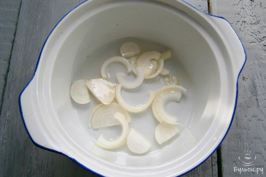 4. На дно подходящей для СВЧ кастрюльки выложить порезанный полукольцами лук в один слой, влить растительное масло.