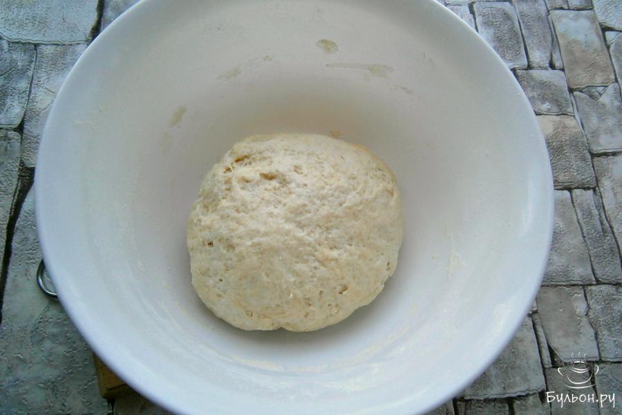 7. Тесто растянуть руками в лепешку, толщиной около 1,5 см, поместить ее в смазанную немного маслом форму или просто на противень. Сверху разместить кружочки свежих помидоров, вдавливая их в тесто, которые чуть посолить.