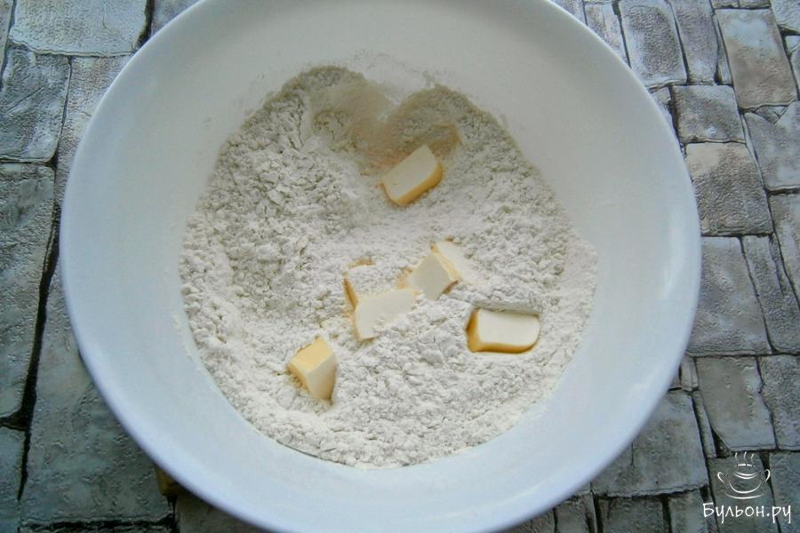 3. Масло перетереть с мучной смесью руками в крошку, затем, влить половину оливкового масла, а также, слегка теплую воду.