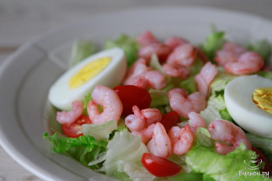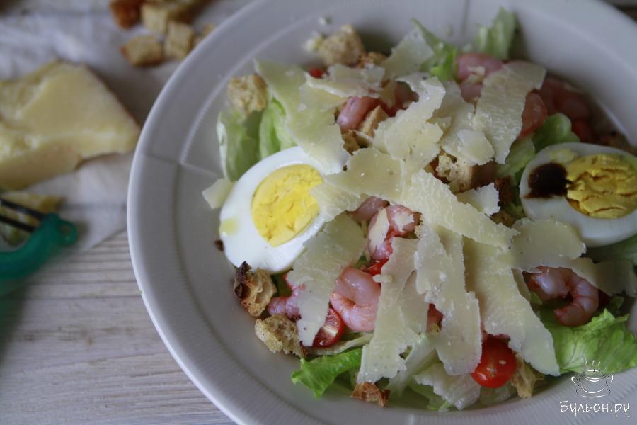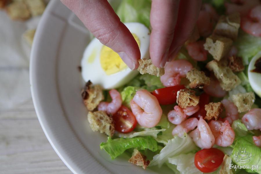 Салат Цезарь с креветками один из вариантов популярного всеми салата Цезарь. Традиционно готовят его с курицей. Однако вариаций приготовлений этого салата много, в него добавляют не только мясо курицы, но еще индейки, креветки, семгу или к примеру тунец. Рецепт этого салата второй по популярности рецепт после Цезаря с курицей. Сегодня предлагаю приготовить его вместе со мной. В этом рецепте были использованы уже готовые креветки в рассоле. Их спокойно можно заменить на свежие, предварительно почистить и пожарить. Утонченность этому рецепту придает заправка из оливкового масла и бальзамического уксуса.