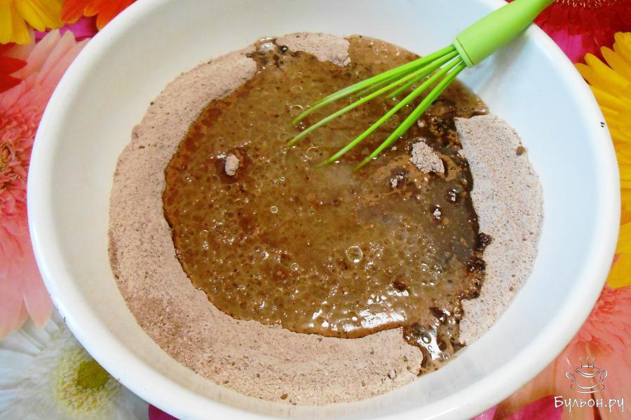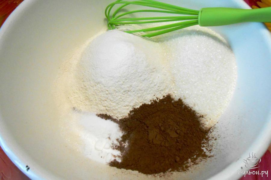 2. В большой емкости соединить муку, 2 стакана сахара, какао, соль, соду и ванильный сахар. Перемешать.