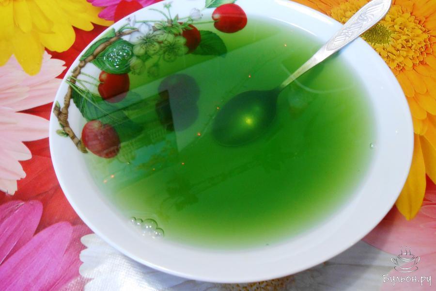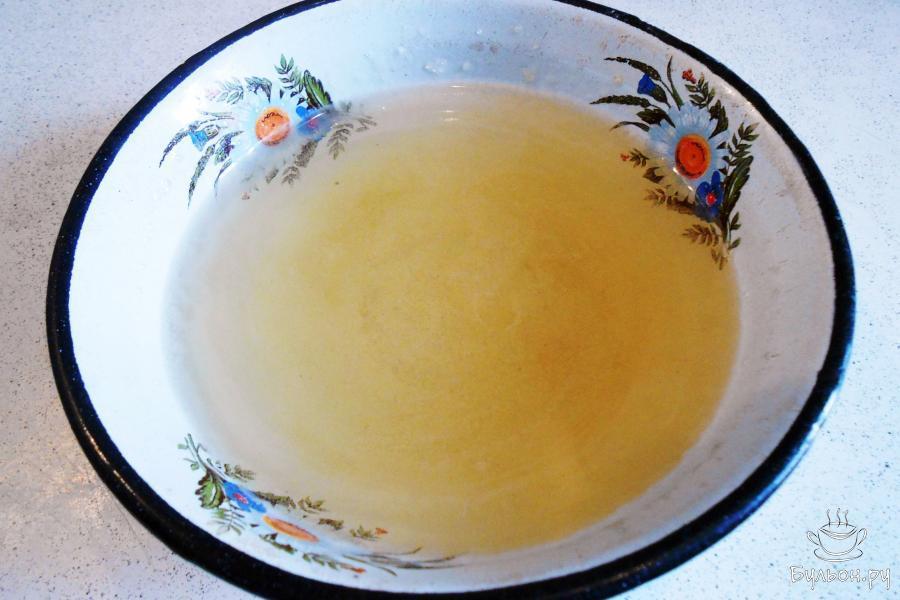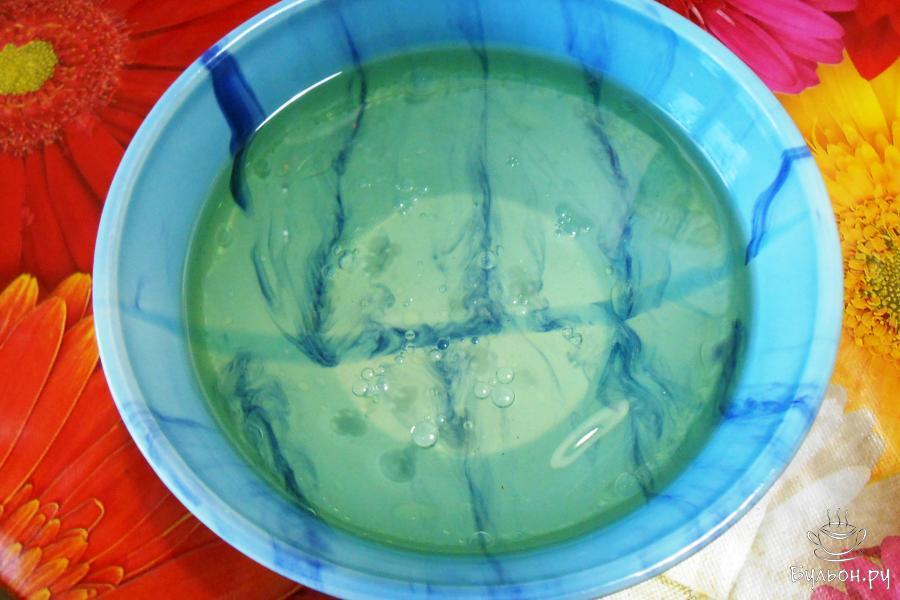 16. 250 мл кипяченой воды нагреть, но не кипятить. В горячую воду постепенно высыпать желе, постоянно помешивая до полного растворения крупинок.