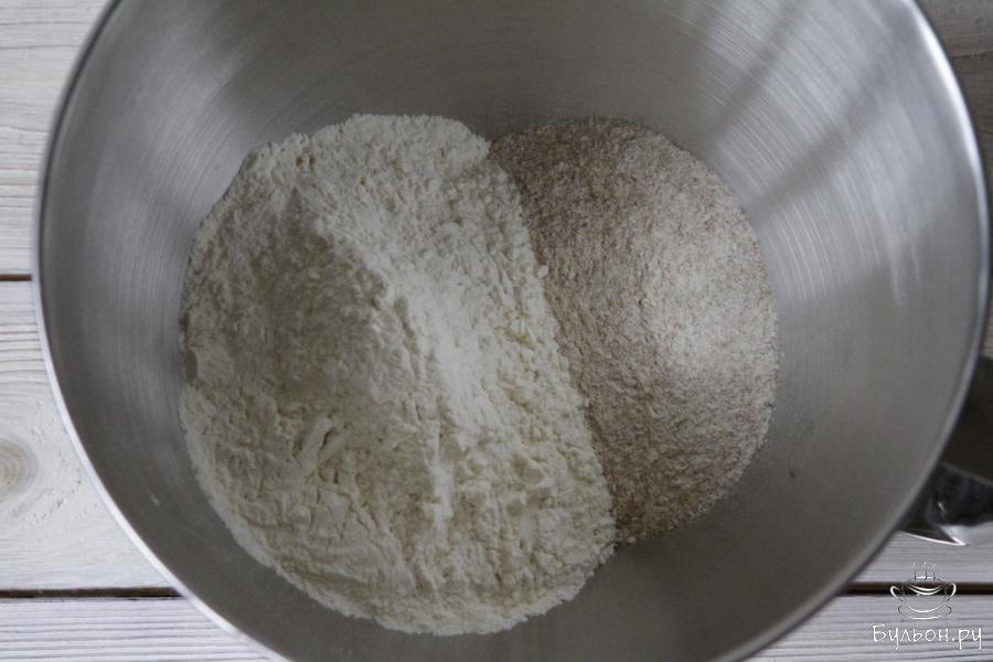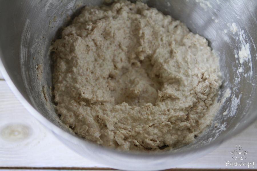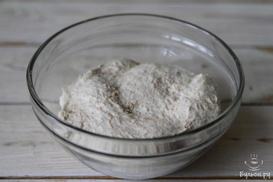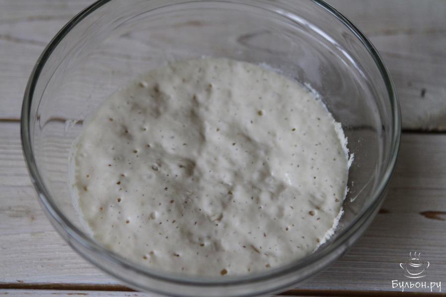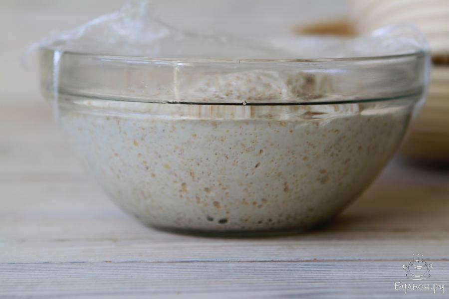 1. Подкормить закваску. На пике взять 10 гр закваски 100 гр пшеничной муки и 100 гр воды. В воде размешать закваску, добавить муку. Затянуть закваску пленкой и оставить на 8-10 часов.