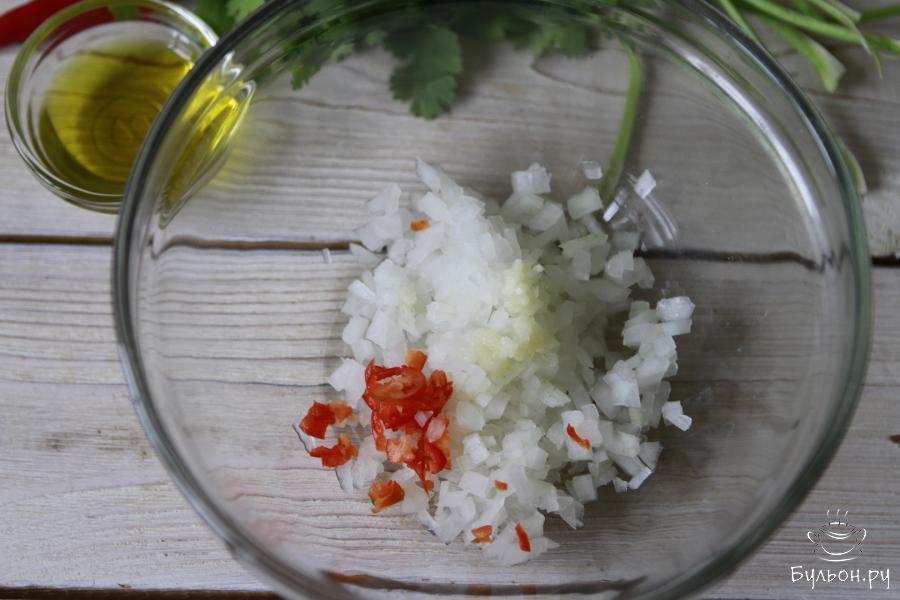 2. Небольшую головку лука почистить и нарезать как можно мельче. Если лук горчит, то промыть его в прохладной воде, откинуть на дуршлаг и отжать.