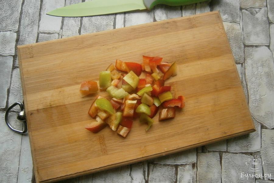 4. Я использовала в салате свежий болгарский перец, поэтому нарезала его кубиками. Перец можно брать любого цвета.