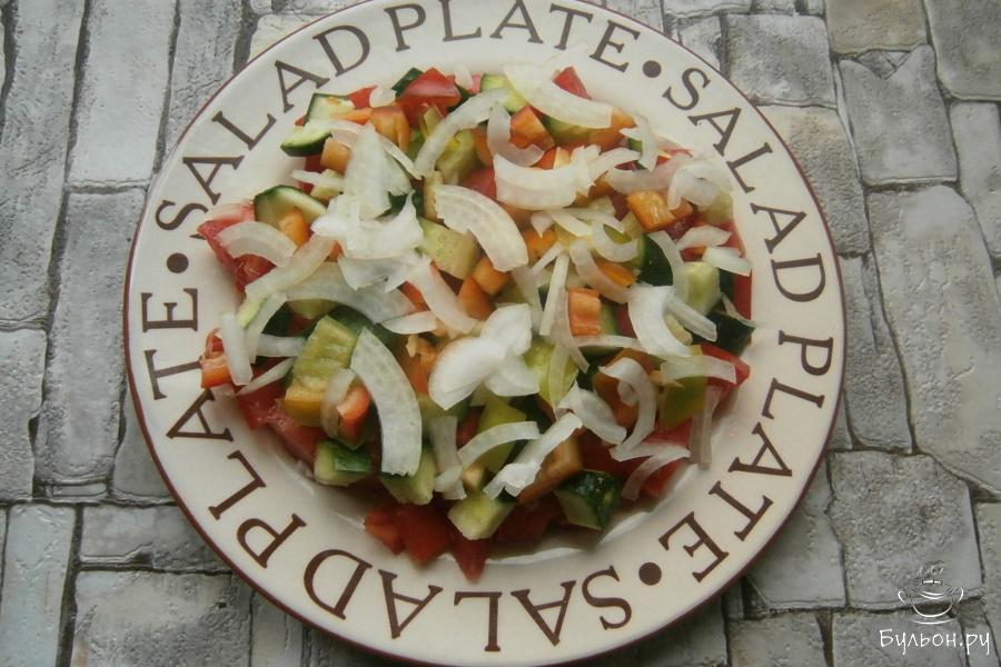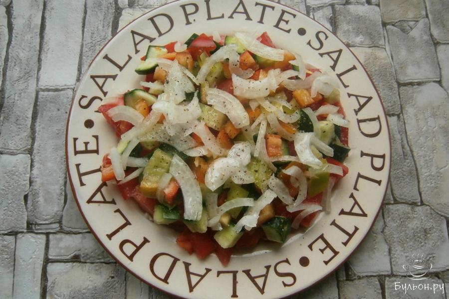 5. На большую тарелку выложить слой помидоров, слой огурцов, затем, болгарский перец и лук. Нижним слоем можно выложить огурцы, далее, все остальное.