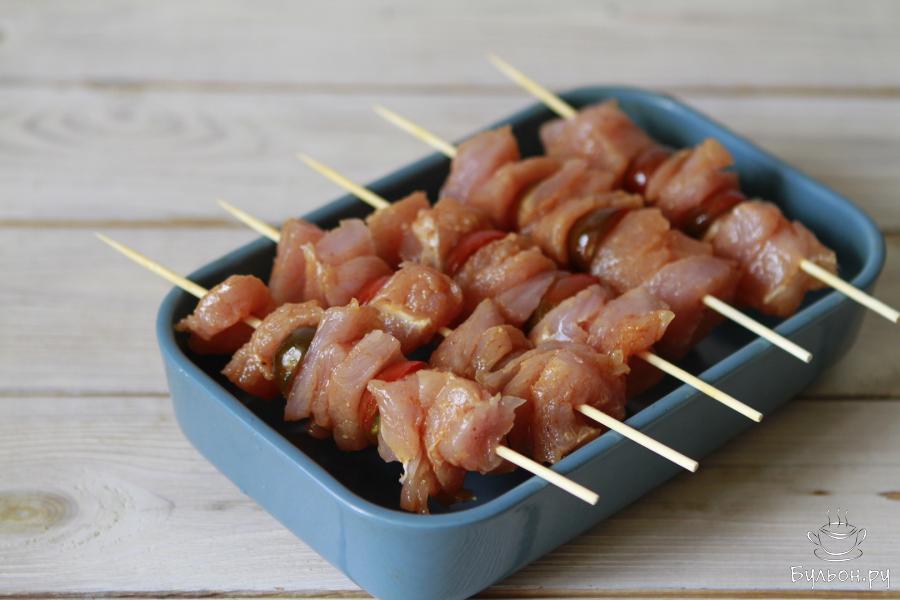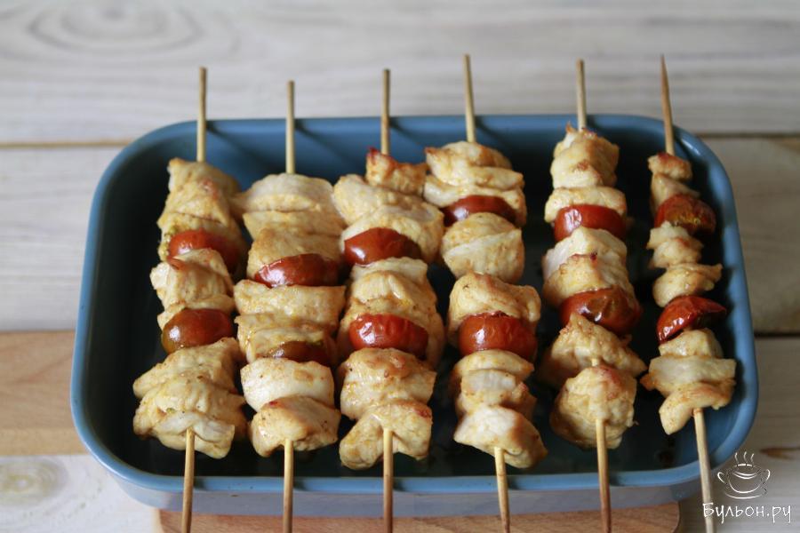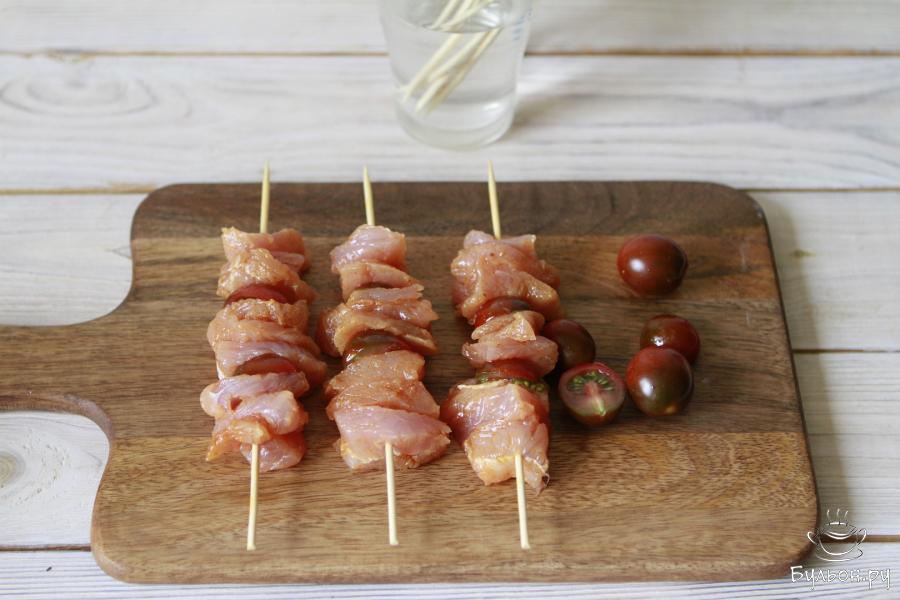 4. Деревянные шпажки замочить в прохладной воде на 20 минут. Кусочки индейки насадить на шпажки чередуя с помидорками черри.