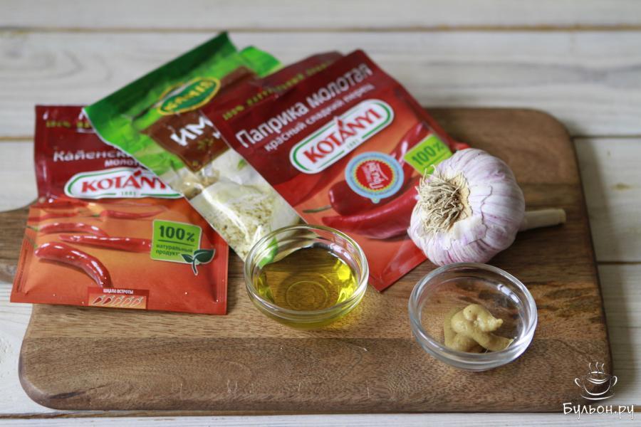 2. Для маринада приготовить все специи по списку, зубчик чеснока, горчицу и оливковое масло. Если вы готовите блюдо для детей, перец чили можно исключить.