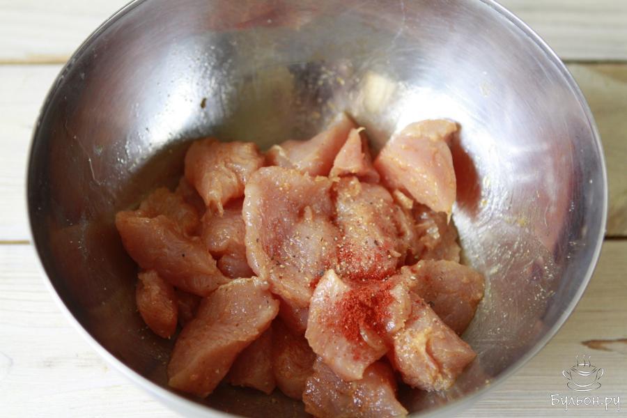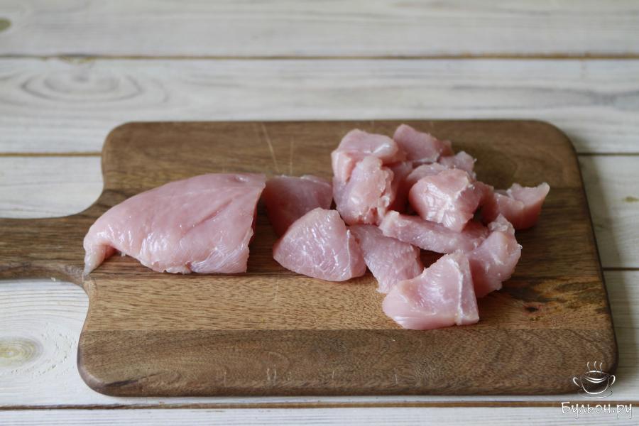 1. Филе индейки промыть, обсушить бумажным полотенцем и нарезать на небольшие кусочки одинакового размера.