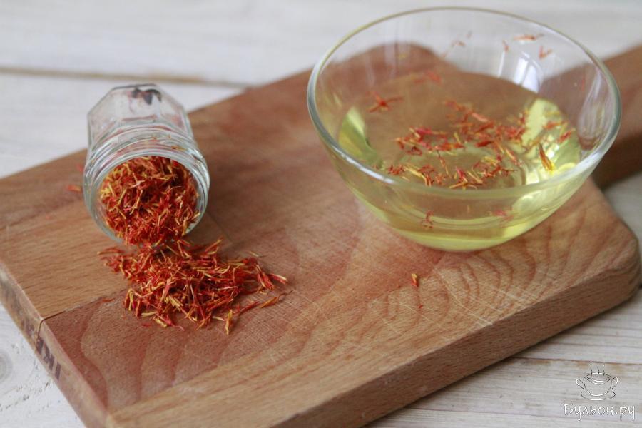7. Шафран развести в горячей воде. Оставить на 10-15 минут, а затем добавить в сотейник. Оставить на плите сотейник еще на 30 минут.