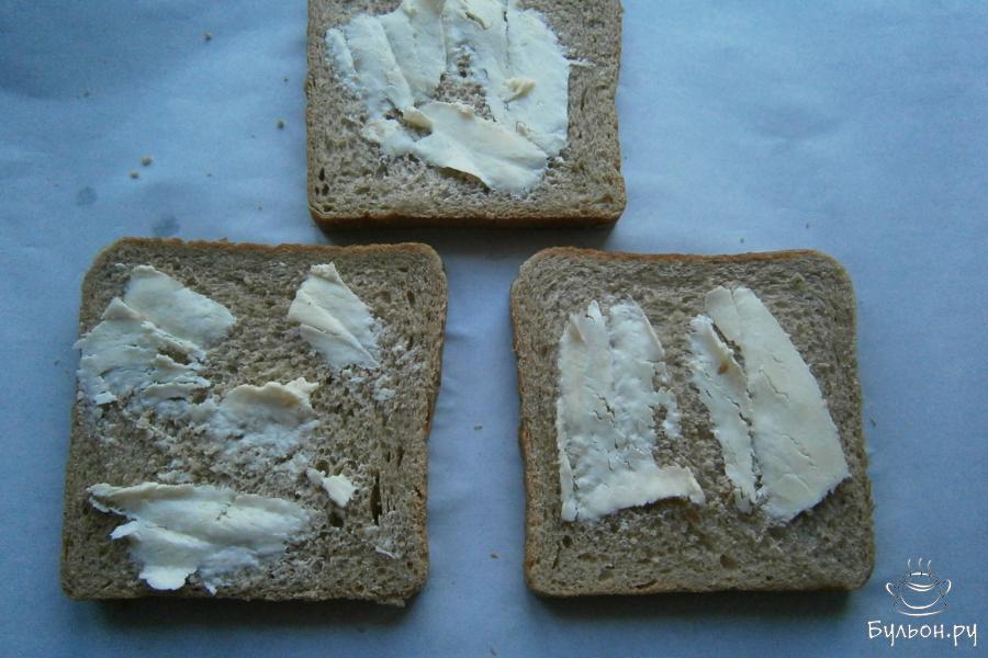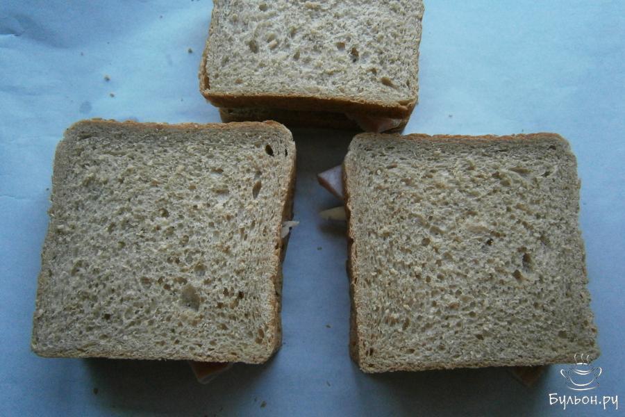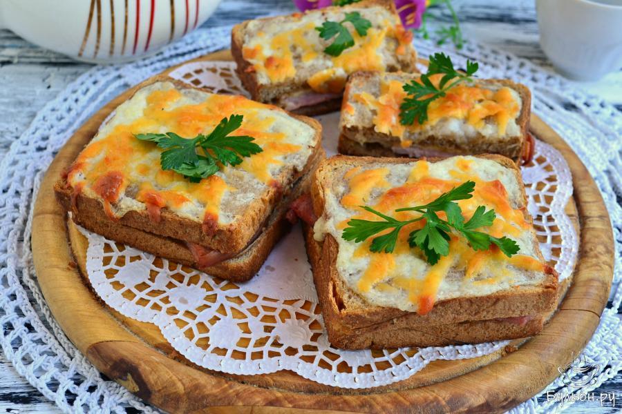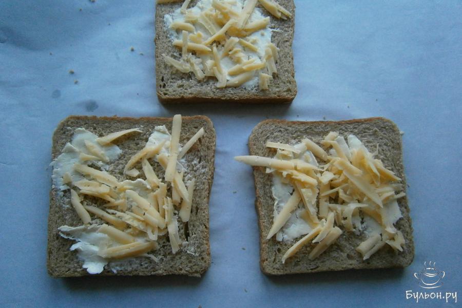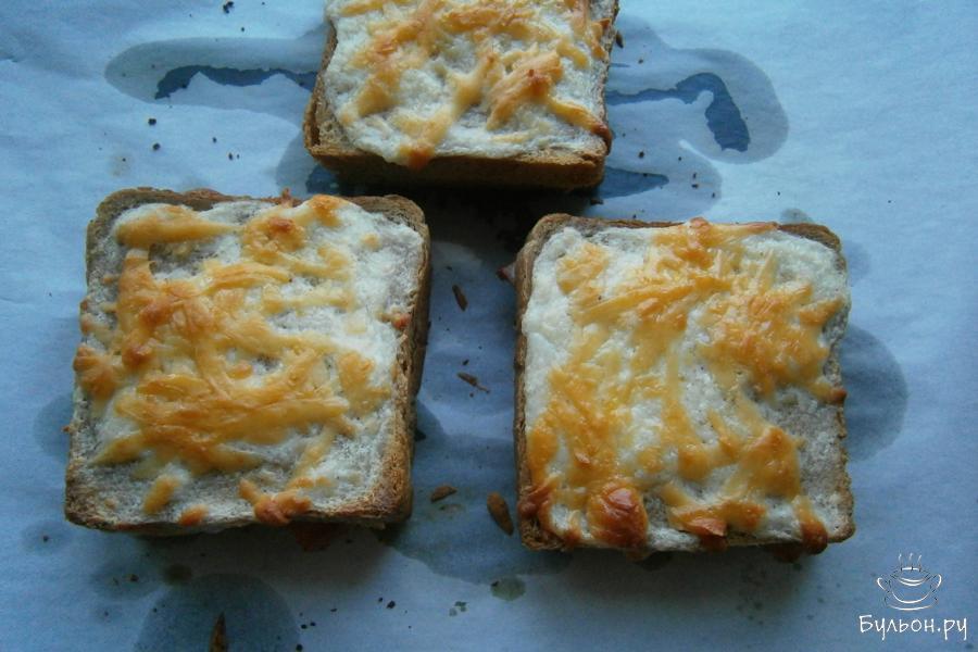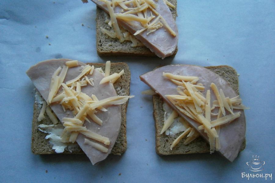 8. Накрыть все оставшимися ломтями хлеба и отправить бутерброды в разогретую духовку. Запекать их при 180 град. минут 10.