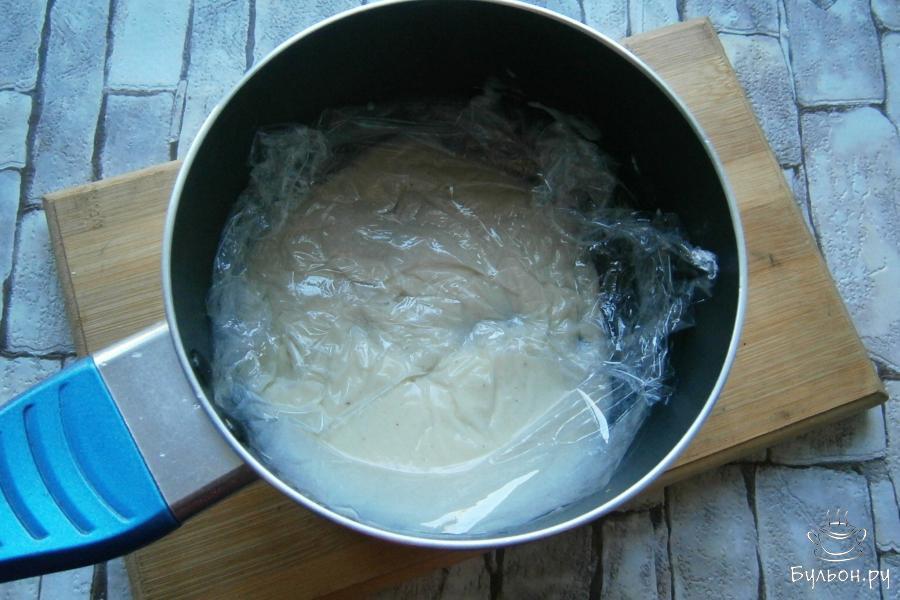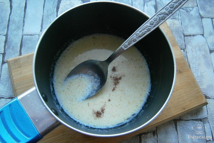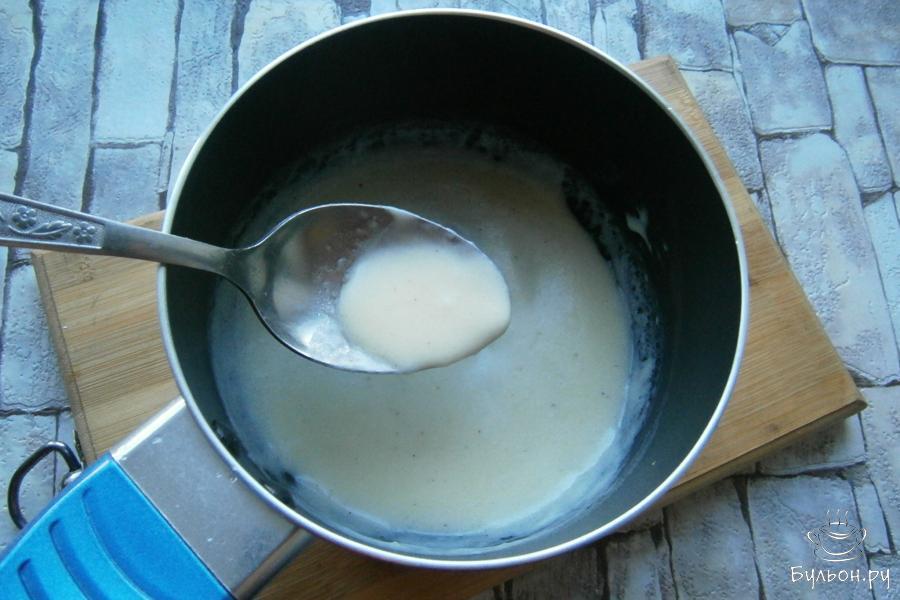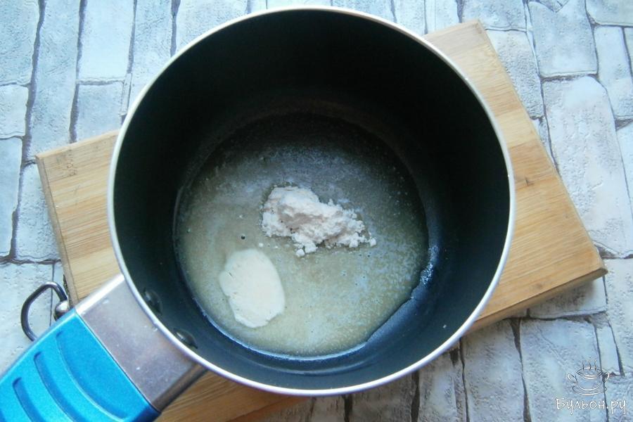 1. Прежде всего нужно приготовить соус. В небольшом ковшике растопить ложку столовую хорошего сливочного масла, всыпать чайную ложечку муки, быстро и интенсивно перемешать.