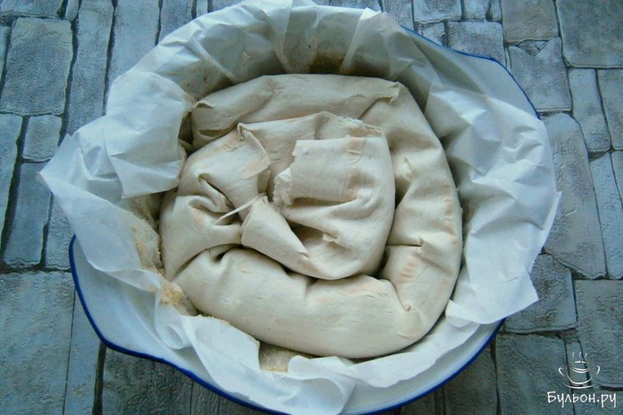 6. Свернуть плотненько рулетом и выложить лаваш в виде улитки в застеленную пергаментом, смазанную 10 г сливочного масла и посыпанную сухарями форму д. 19-20 см.