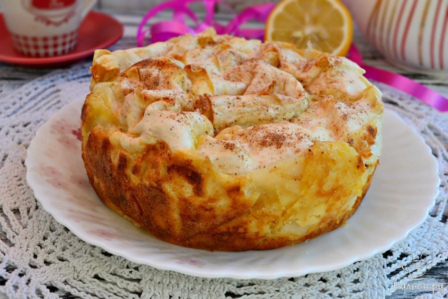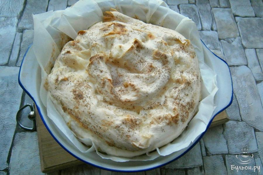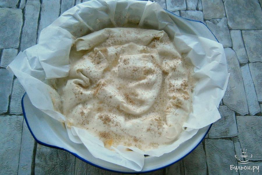 9. Дать пирогу в форме остыть, убрать пергамент, аккуратно порезать и подать к столу. Приятного аппетита.