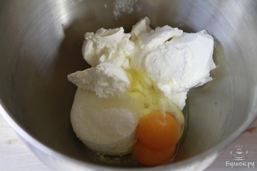 2. В чашу миксера переложить творог, сыр рикотту, сахар, крахмал (кукурузный или картофельный) и два яйца.