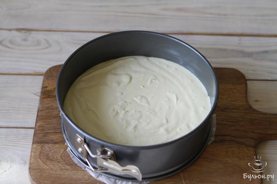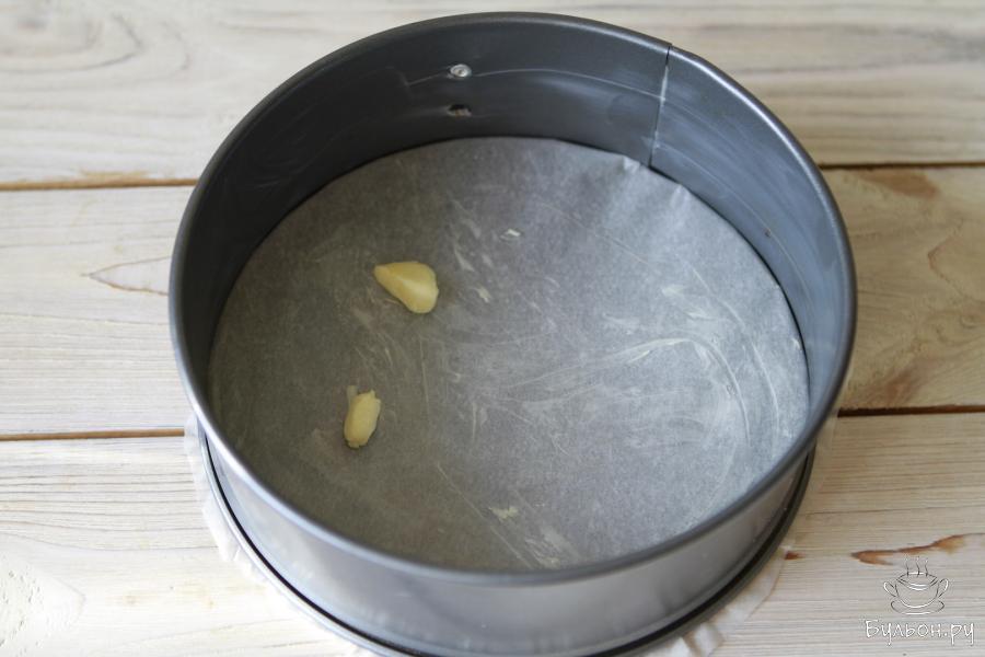 4. Дно съемной формы застелить пергаментом. Бока смазать сливочным маслом. Обсыпать форму мукой (эффект французской рубашки) и встряхнуть форму. Такая защита не позволит прилипнуть запеканке к бокам формы.