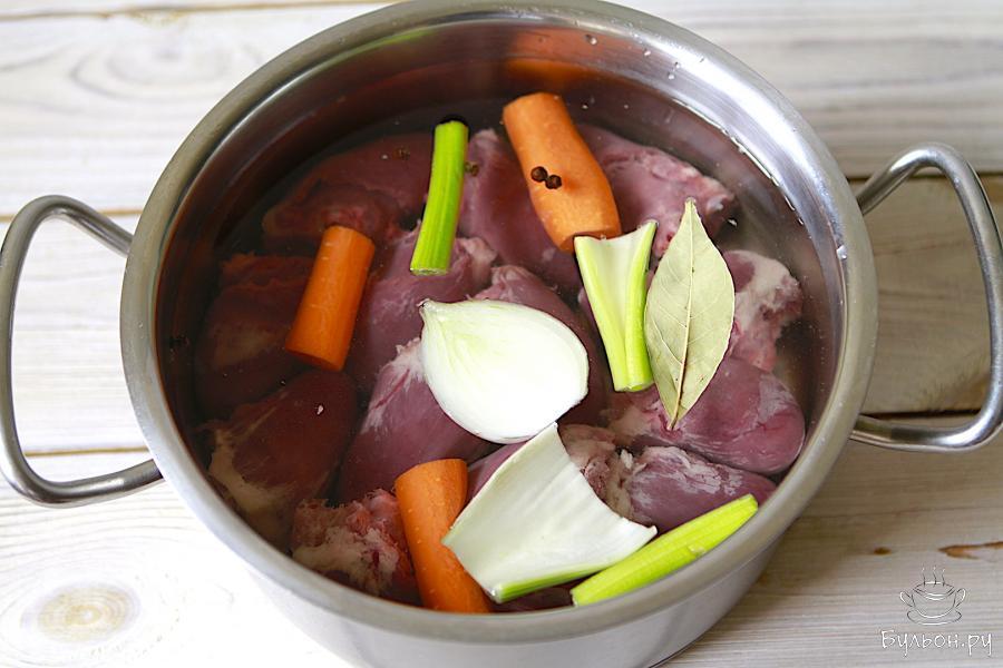 2. Сердечки переложить в кастрюлю, залить водой и довести до кипения. В бульон добавить одну луковицу, одну небольшую морковь, стебли сельдерея, лавровый лист и черный перец горошком. Варить сердечки на среднем огне в течение 1-1,5 часов.