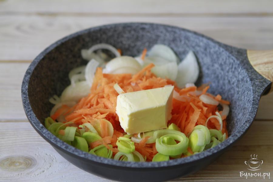 3. Другую головку репчатого лука нашинковать полукольцами, лук порей нарезать, кольцами, а морковь натереть на средней терке.