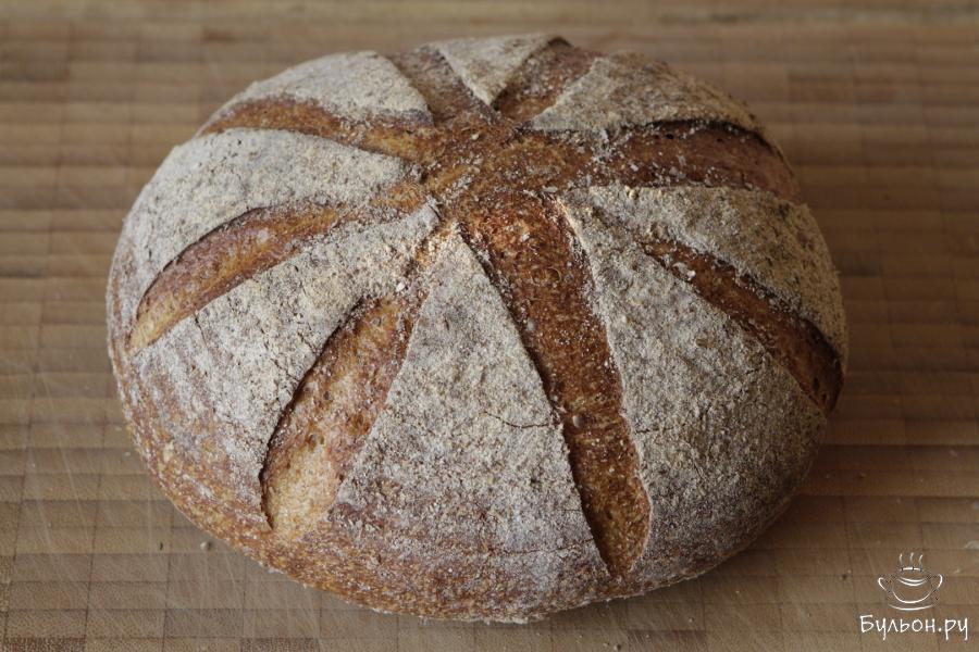 10. Первые 15 минут выпекать с паром при 250 градусах. Потом температуру снизить до 200 градусов и выпекать до готовности (еще 25-30) минут. Хлеб остудить на решетке. Приятного Вам аппетита.