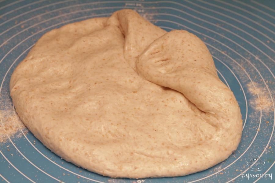 6. Оно должно увеличиться в 1.5-2 раза. Далее тесто выложить на рабочую поверхность, слегка растянуть. Сложить от края к центру.