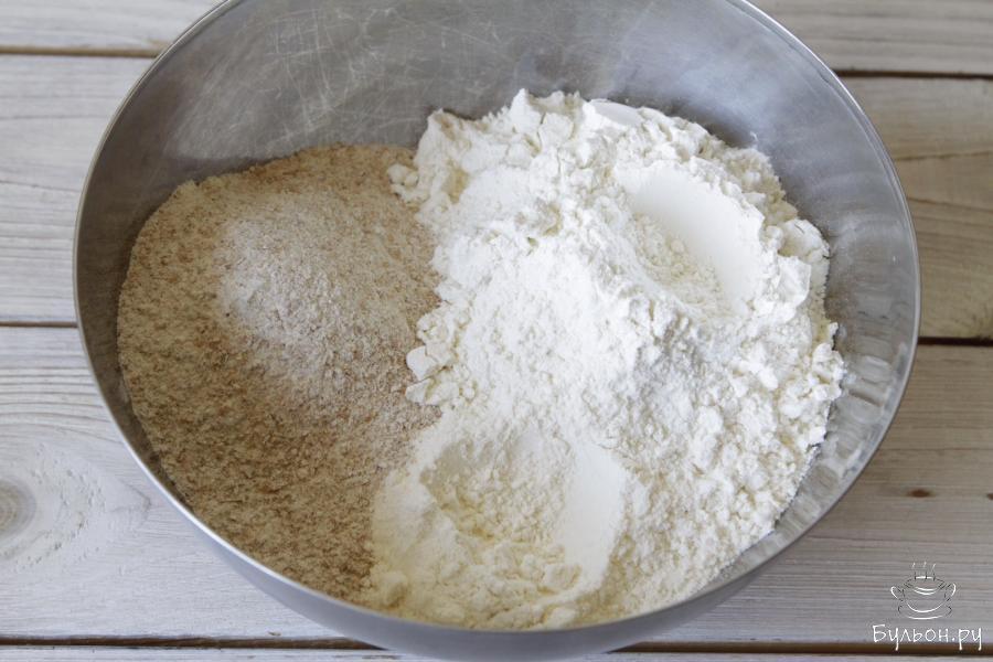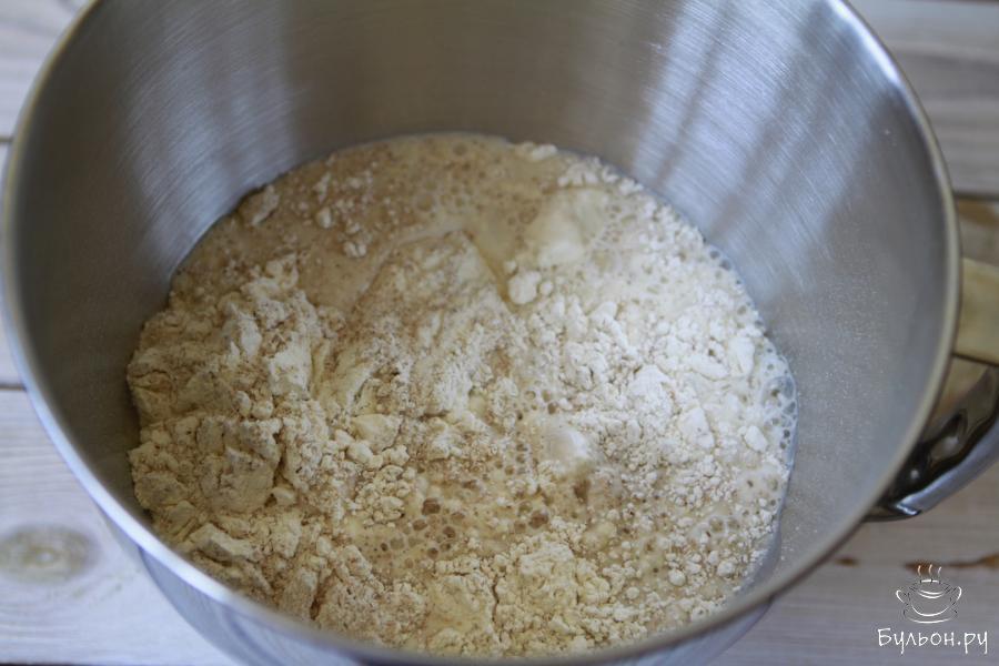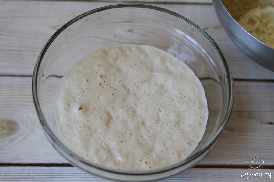 1. Обновить закваску. Для опары вам потребуется 7 гр пшеничной закваски, 85 гр пшеничной муки высшего сорта и 105 гр. воды. Все ингредиенты перемешать. Посуду затянуть пищевой пленкой и оставить на 8-10 часов. На поверхности появится множество пузырьков.