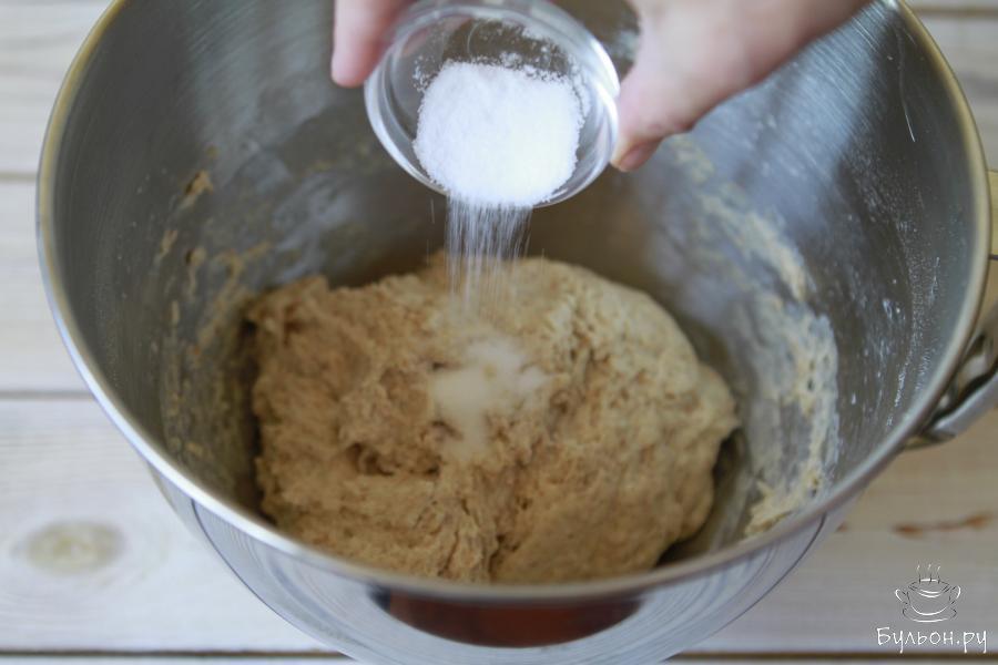4. Замешиваем тесто на 1 скорости в течение 1-2 минут. Необходимо чтобы мука и вода соединились. Оставляем тесто на 20 минут (аутолиз). Через 20 минут продолжить замес и ввести соль.