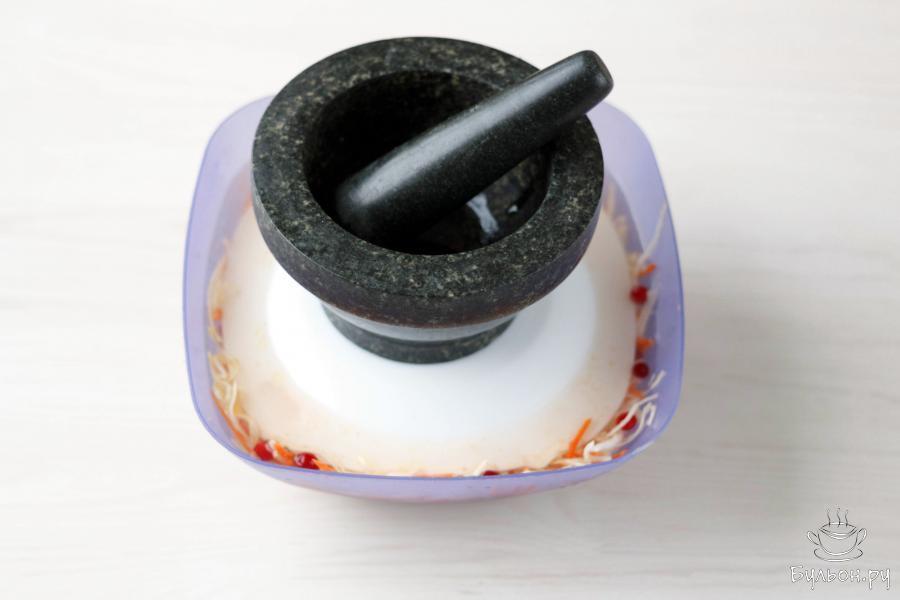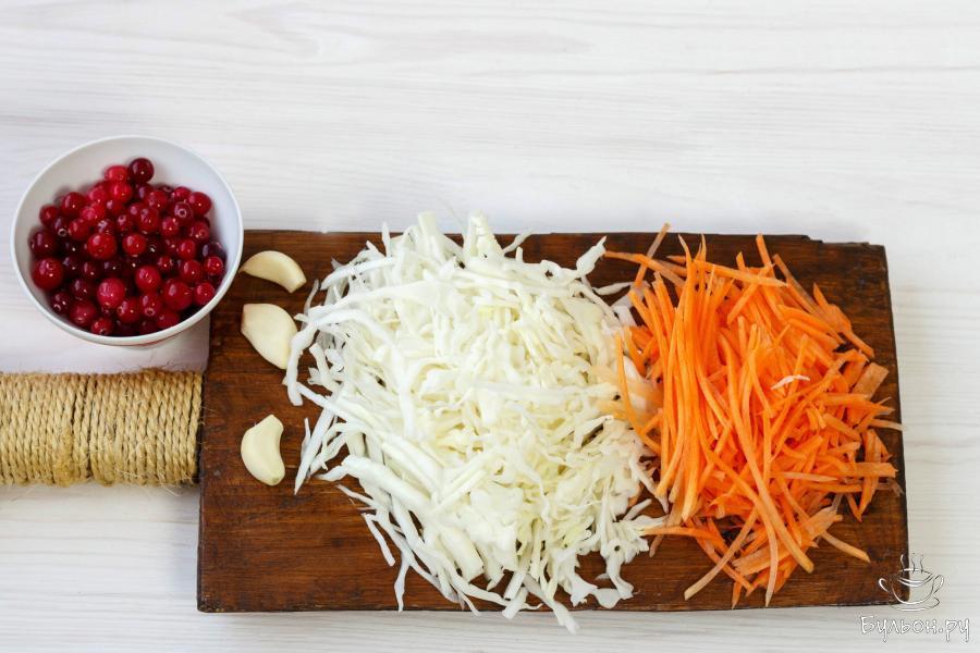 1. Подготовьте овощи: очистите чеснок, нашинкуйте на терке или нарежьте тонкими полосками капусту и морковь.