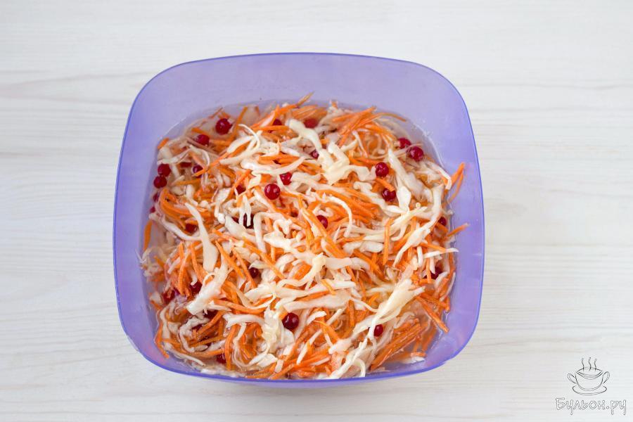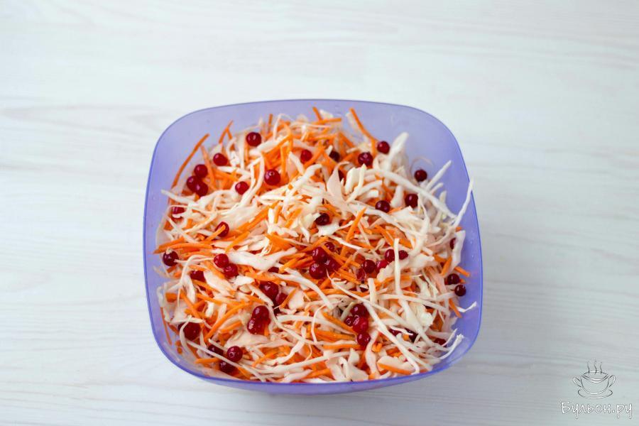 2. Смешайте овощи. Добавьте измельченный чеснок и клюкву. Вместо клюквы, можно добавить нарезанный небольшими кусочками сладкий перец или яблоко.