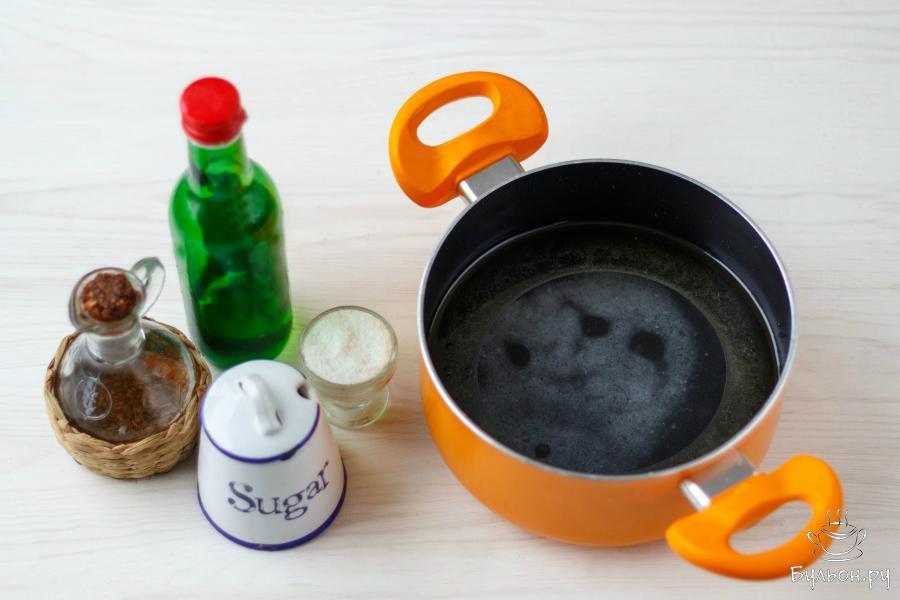 3. Приготовьте маринад. Соедините воду, растительное масло, уксус, соль и сахар. Тщательно все перемешайте и доведите смесь до кипения.