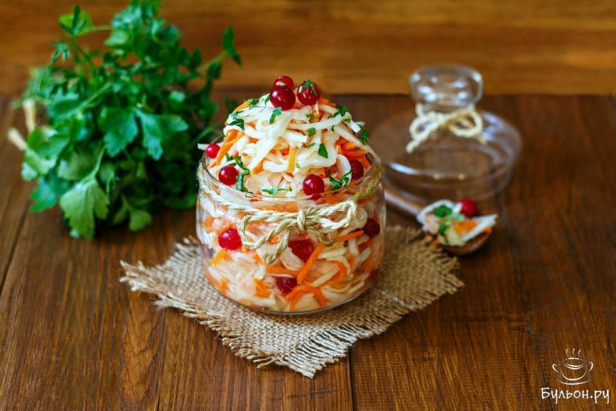 5. Установите легкий гнет и оставьте капусту при комнатной температуре на 5-6 часов. Затем поместите капусту в холодильник. На следующий день закуску можно подавать к столу. Настоявшись еще несколько дней, она станет только вкуснее.