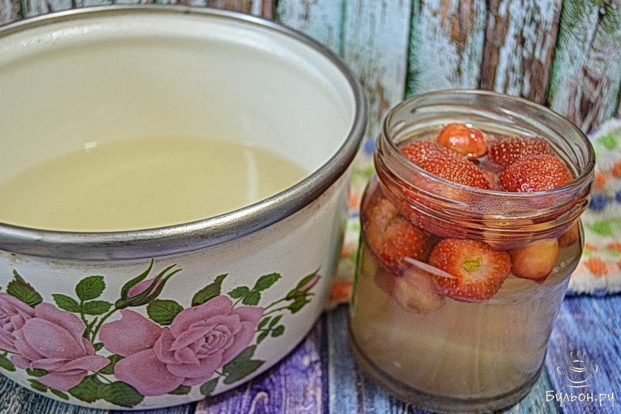 8. Поставим стерилизоваться в кастрюлю, наполненную теплой водой. Стерилизуем полулитровые банки 8 минут при кипении.