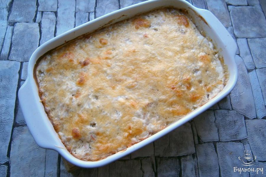 9. Запекать блюдо в духовке, при 180 гр. около 35 мин. Дать запеканке в форме остыть до теплого состояния, а затем, порезать на части и подать к столу. Приятного аппетита.