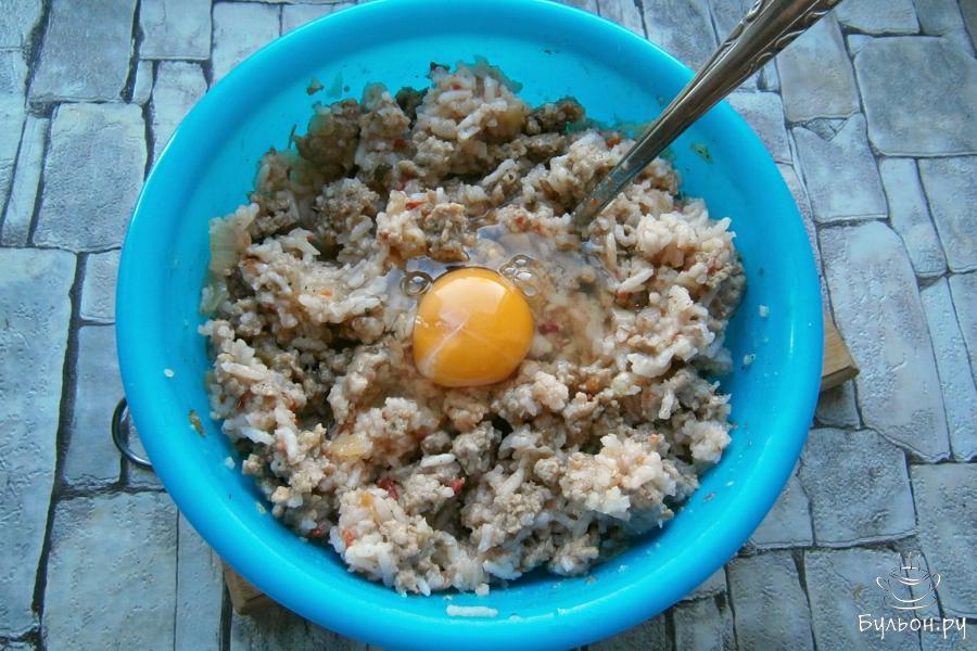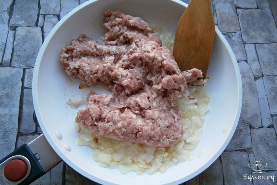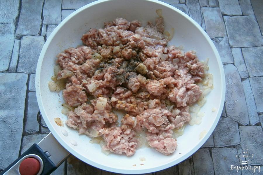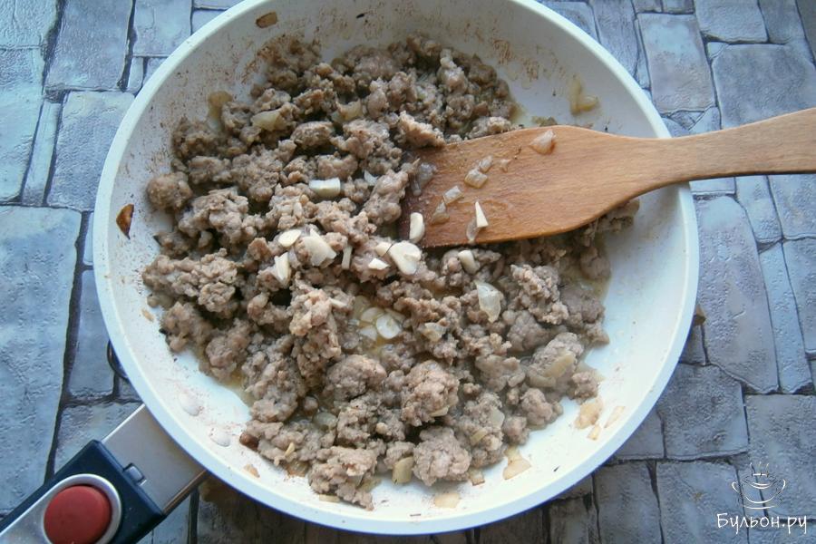 5. Фарш обжарить минут 10, затем добавить измельченный чеснок, все перемешать, газ выключить. Фарш немного остудить.