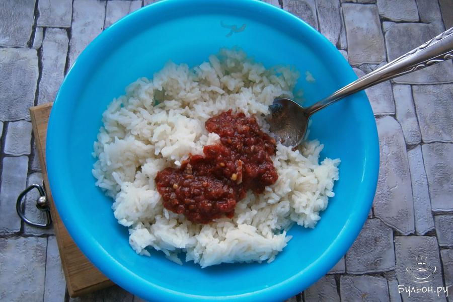 1. Рис отварить до полной готовности, промыть горячей водой, остудить до теплого состояния. Добавить к рису аджику или томатную пасту, соус.