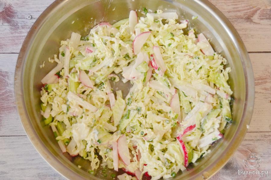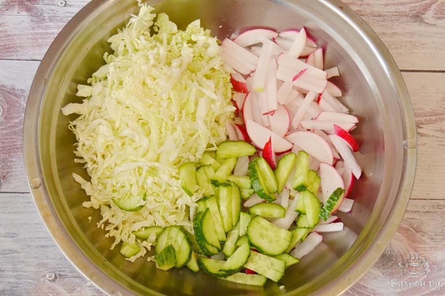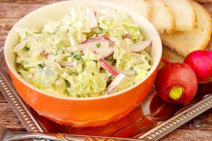 7. Витаминный салат из редиски, огурца и пекинской капусты готов. Готовится он очень просто и подойдет к любому второму блюду или гарниру.