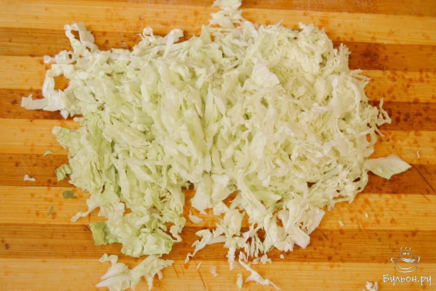 2. Капусту пекинскую нашинкуем очень тонко. Сделать это не трудно, так как пекинская капуста очень нежная и легко режется.