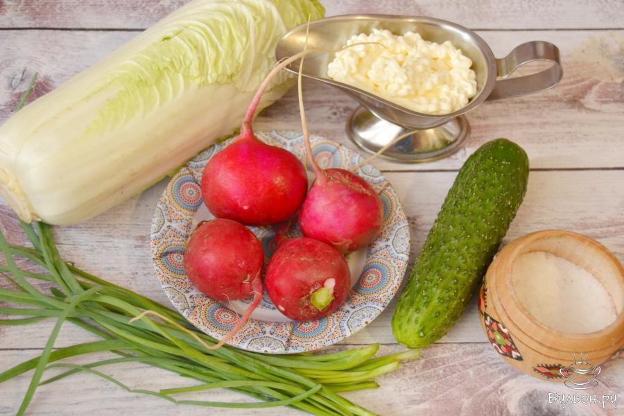Салат с пекинской капустой, редиской и огурцом я обычно готовлю ранней весной, когда первая редиска только появляется, и она еще молоденькая, нежная и вкусная. Правда, сейчас в супермаркетах можно найти любые продукты вне зависимости от сезона, но с первой сезонной редиской тепличные овощи, конечно же, сравниться не могут. Тем не менее, приятно, что наслаждаться витаминным салатом мы можем не только в сезон, но и круглый год. Основа этого салата - пекинская капуста. Остальных же компонентов можно брать любое количество - больше или меньше, чем указано в рецепте.