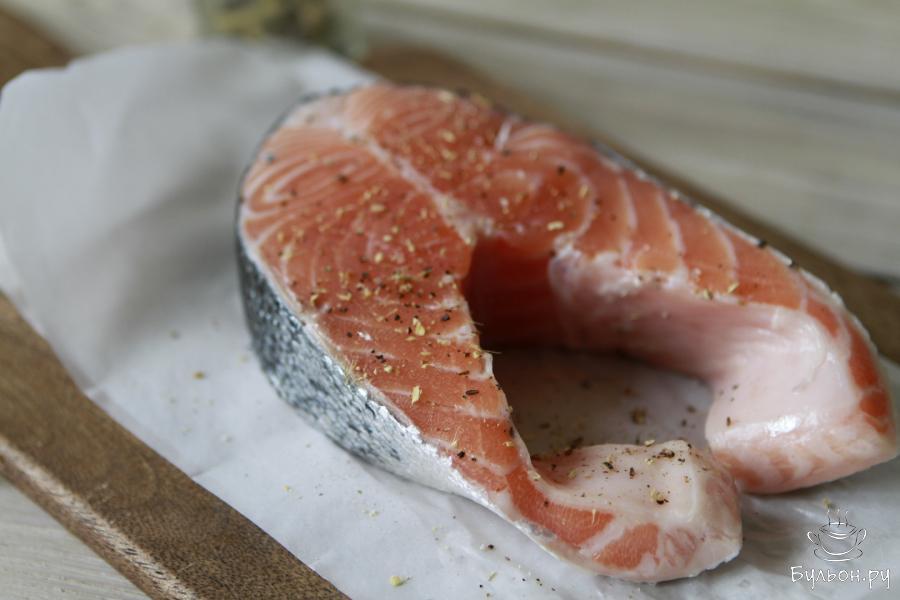 4. Разогреть сковороду и на среднем огне обжарить стейк с двух сторон до приятной золотой корочки, примерно, по 5-7 минут с каждой стороны.