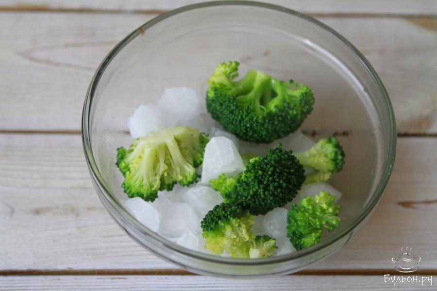 5. Брокколи разделить на соцветия. Вскипятить воду, забросить соцветия и варить 2-3 минуты. Соцветия брокколи откинуть на дуршлаг, переложить в чашу и добавить лед. Это поможет сохранить цвет брокколи.