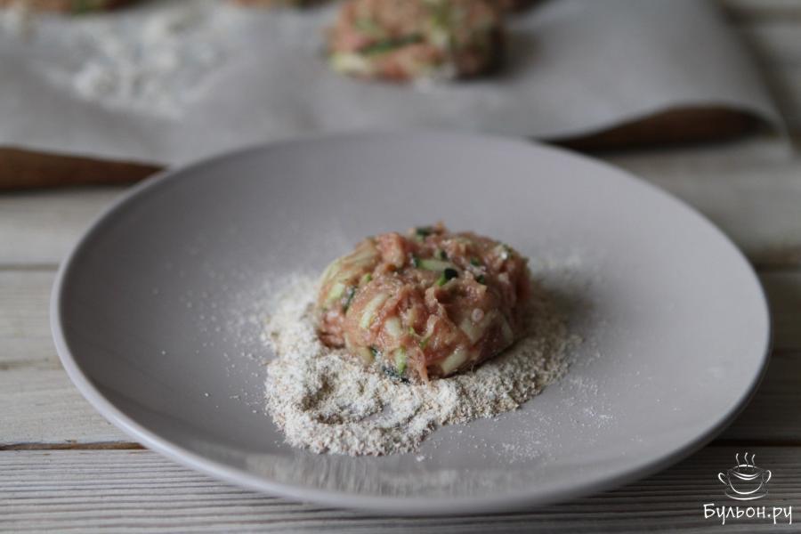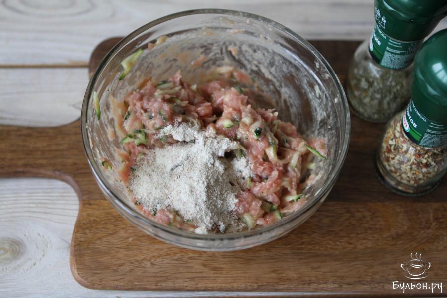 4. Все ингредиенты хорошо перемешать, фарш слегка отбить. Добавить одну или более столовых ложек цельнозерновой муки или панировочных сухарей.