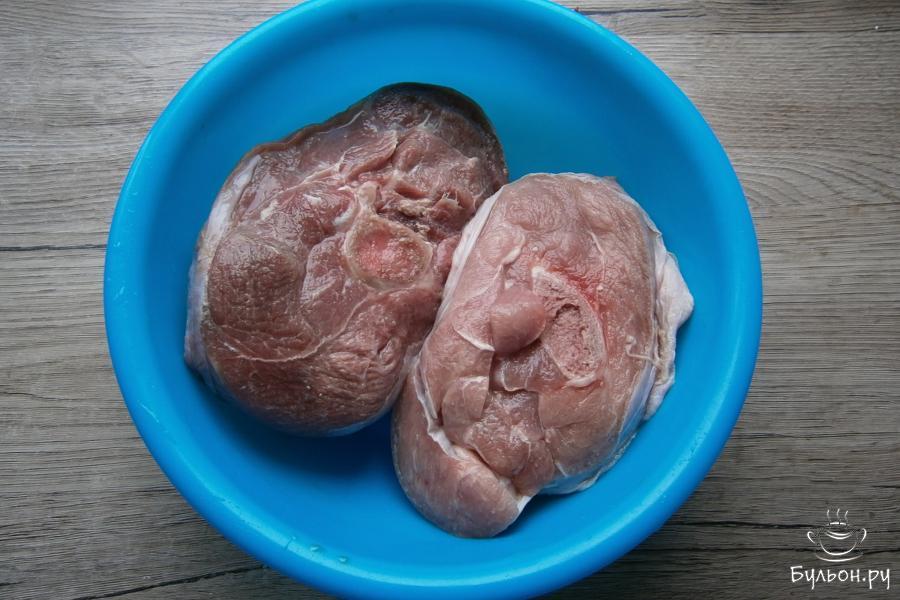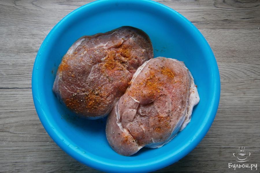 1. Если у вас целая голень индейки, ее нужно порубить на стейки или приобрести их отдельно. Два крупных стейка помыть и обсушить.