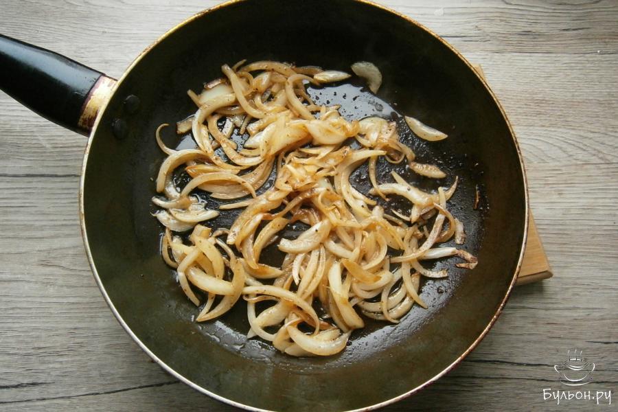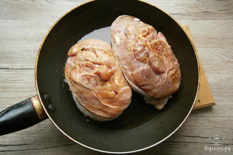 5. Затем, стейки без лука немного обсушить салфетками, поместить на горячую сковороду с 2 ст. ложками растительного масла. Жарить на среднем огне 3 минуты.