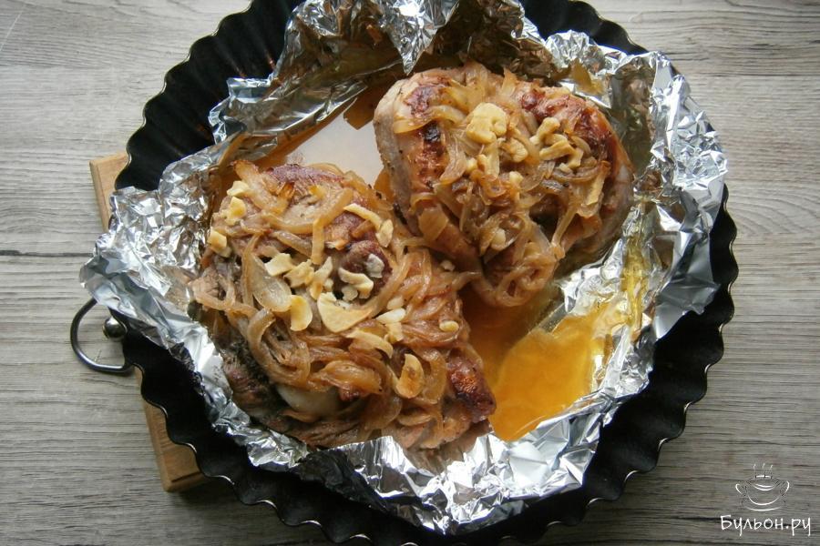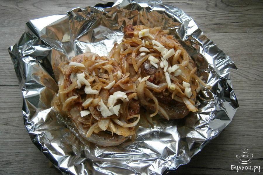 6. Стейки перевернуть и обжарить еще ровно 3 минуты с другой стороны, выложить их в форму, застеленную фольгой в два слоя.