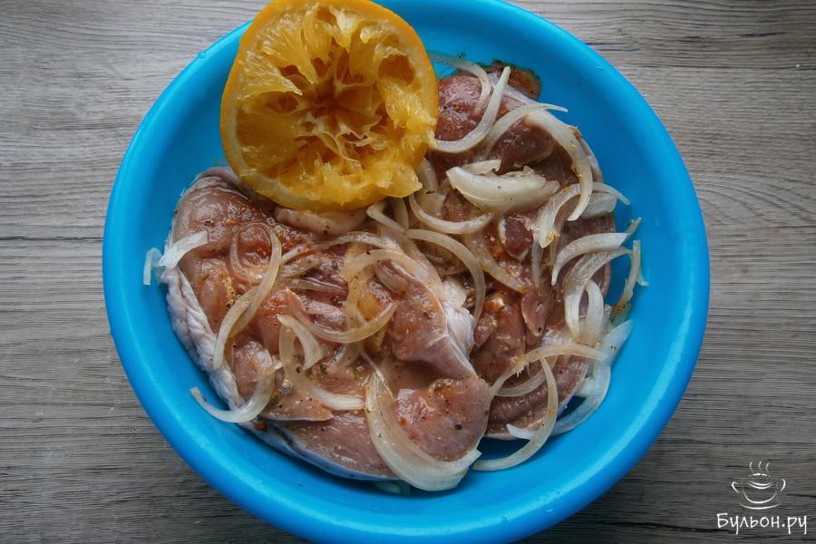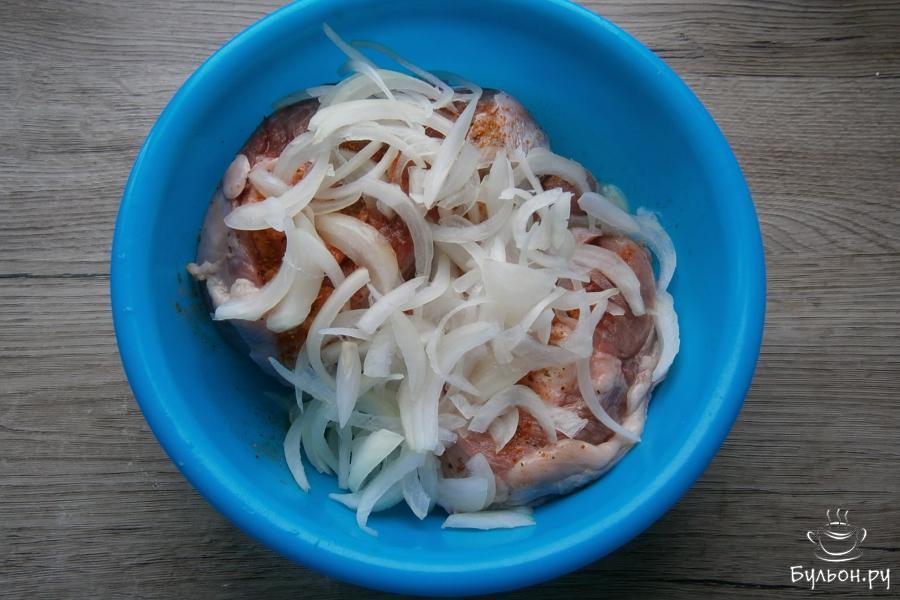 3. Репчатый лук порезать тонкими перьями или полукольцами, добавить его в миску с индюшиными стейками, хорошо помять руками и перемешать с мясом.