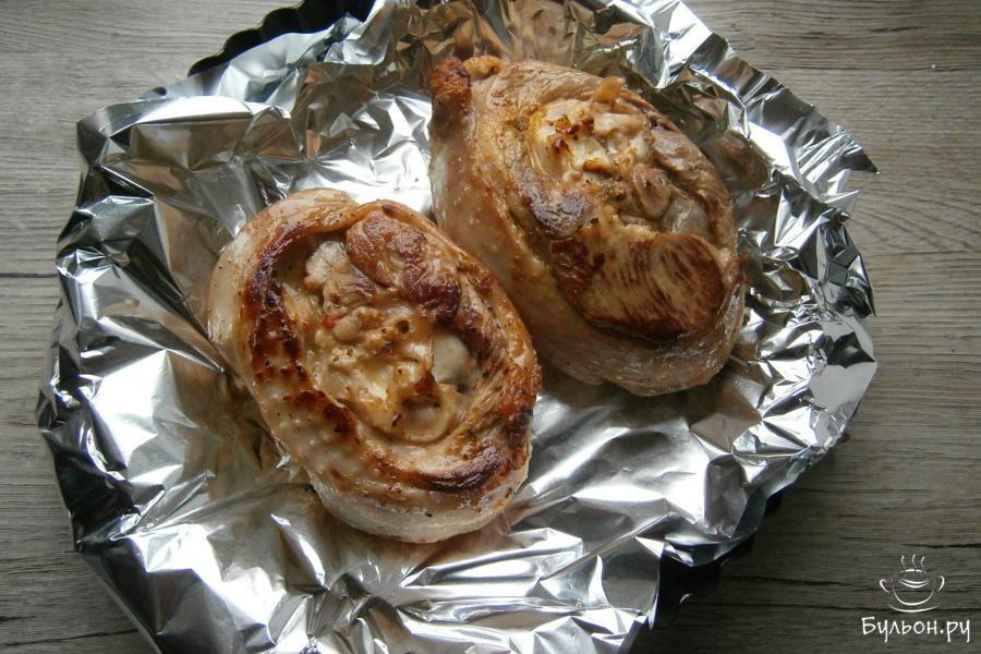 9. Накрыть мясо фольгой и отправить запекаться в духовку на 1 час. Температуру выставить 180-190 град. Снять фольгу и дать подрумяниться индейке еще минут 15.