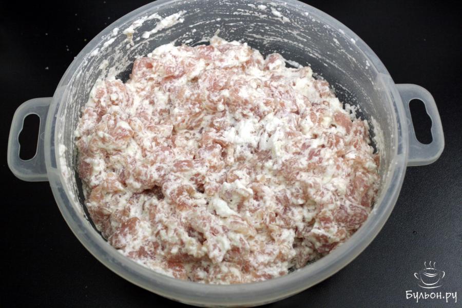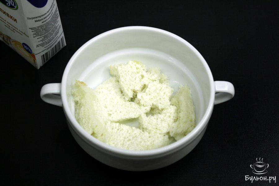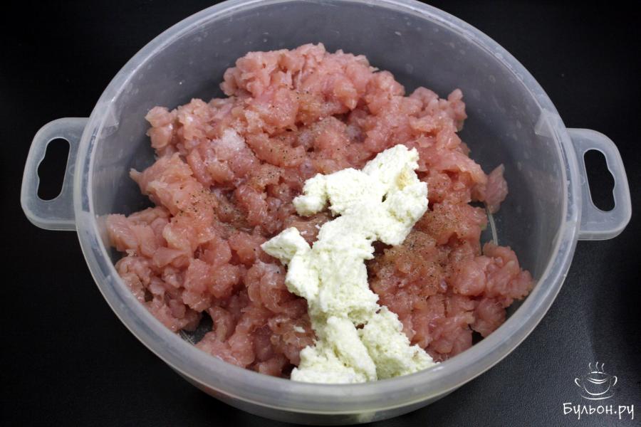 4. В миске соединить фарш из индейки и размоченный кусочек хлеба, посолить и поперчить по вкусу. Добавить оставшееся молоко или можно заменить водой. Вмешать жидкость в мясо. Оставить на пару минут, пока будет готовиться форма для запекания.