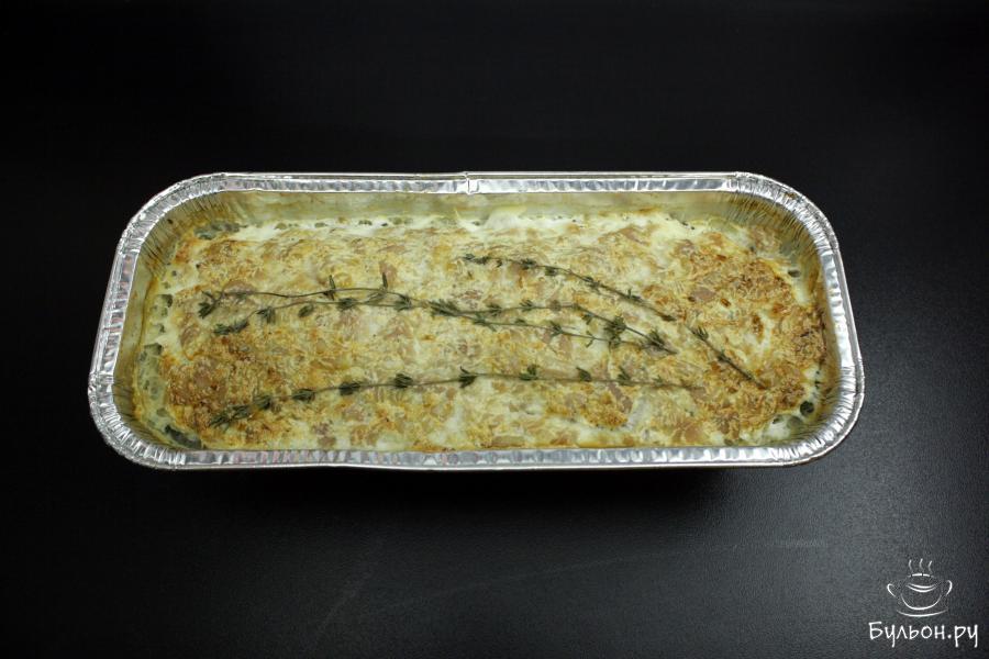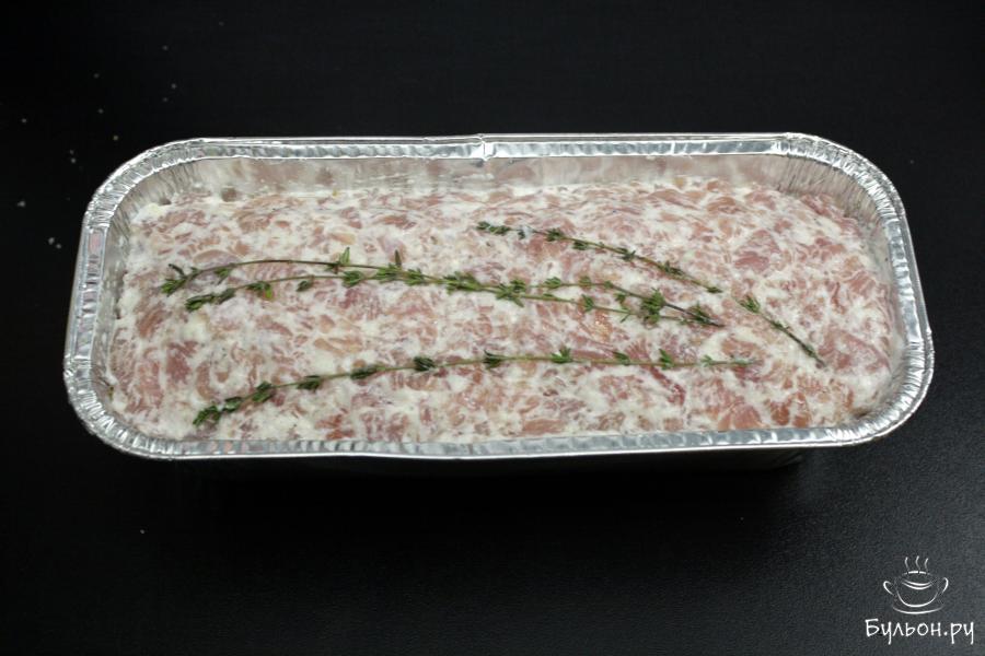 8. Поверх выложить оставшийся фарш из индейки, придать форму бугорка, украсить веточками тимьяна. Так же можно использовать розмарин или веточки укропа.