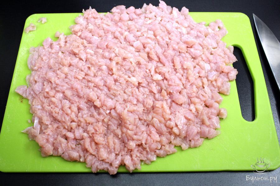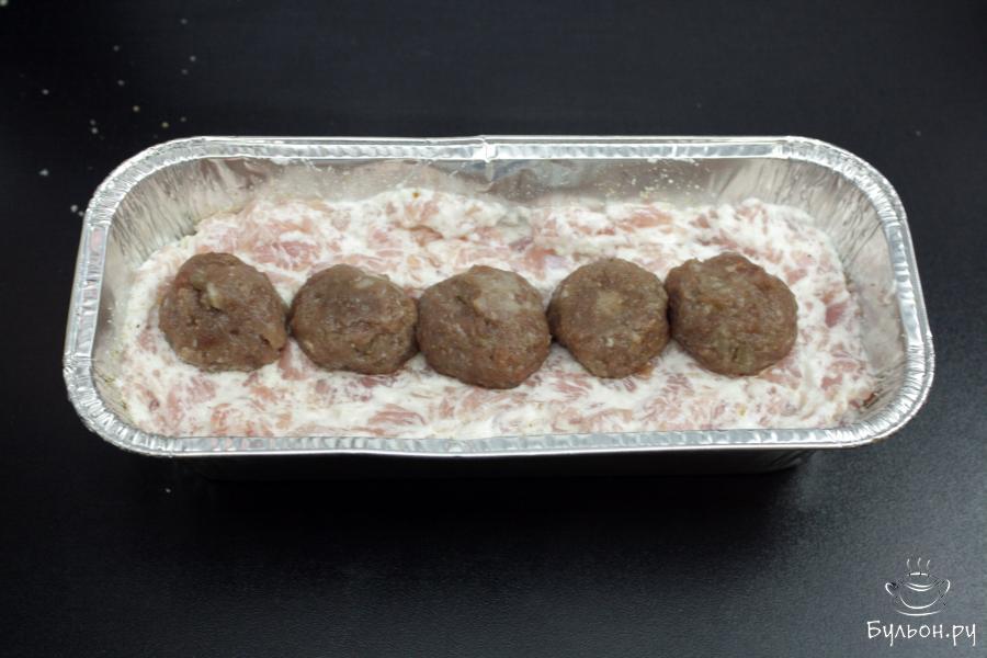 7. В форму выложить примерно половину фарша, слегка разровнять. По центру уложить фарш из говядины, можно шариками.