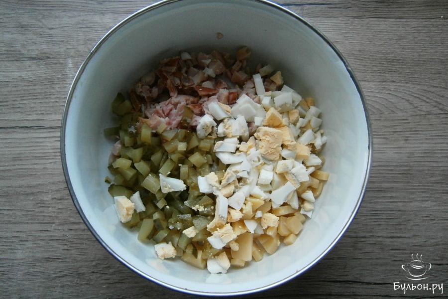 1. Картофель и куриные яйца нужно предварительно отварить и почистить. Для приготовления салата можно взять копченую грудку или копченый окорочок, как у меня. Мясо нужно освободить от костей порезать небольшими кусочками.