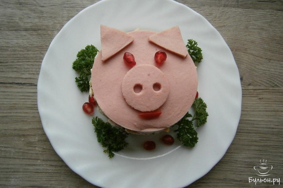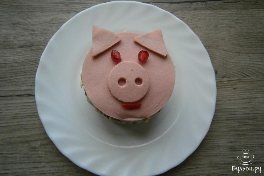 6. Для украшения нужно использовать круглый ломоть вареной колбасы равный диаметру салата и маленький кружочек - это будет пятачок свинки, который можно вырезать рюмкой.